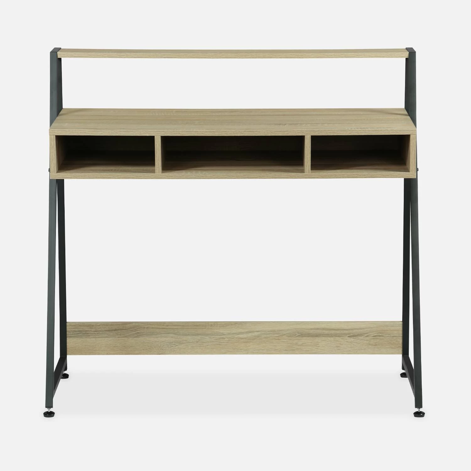 Adoptez le style industriel avec ce bureau au design loft. Alliant métal et décor bois, il est l’équilibre parfait entre authenticité et modernité. Ce meuble accueillera facilement vos fournitures et votre matériel de bureau grâce à ses 3 niches et à son grand plateau. Quant à son étagère, elle vous permettra de disposer un écran ou de décorer votre pièce selon vos goûts en y ajoutant des petits accessoires déco. Cerise sur le gâteau : ce bureau s’adapte à vous avec ses pieds réglables en hauteur (1,5cm). Minimaliste et fonctionnel, il sera parfait pour vous accompagner lors de longues journées de travail.