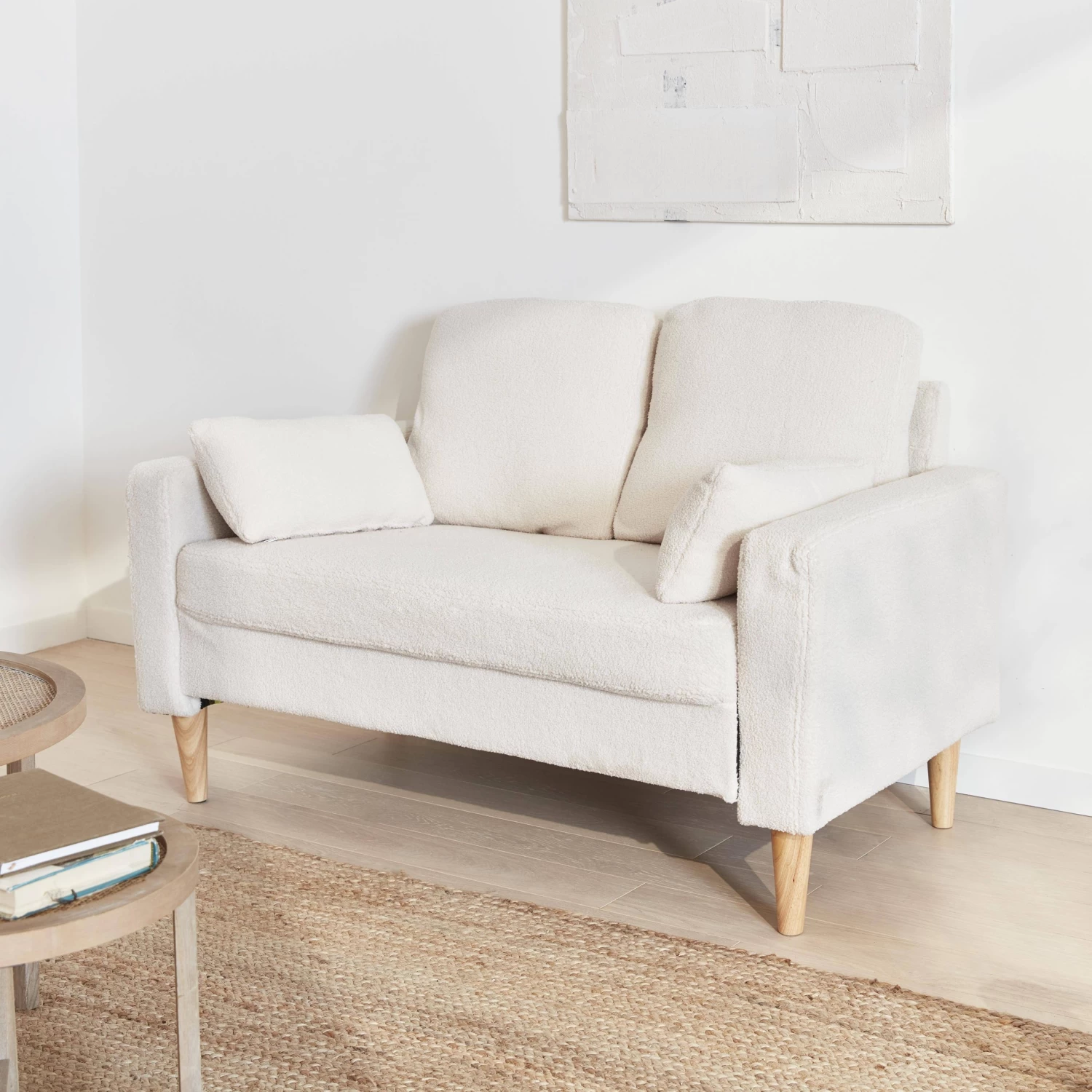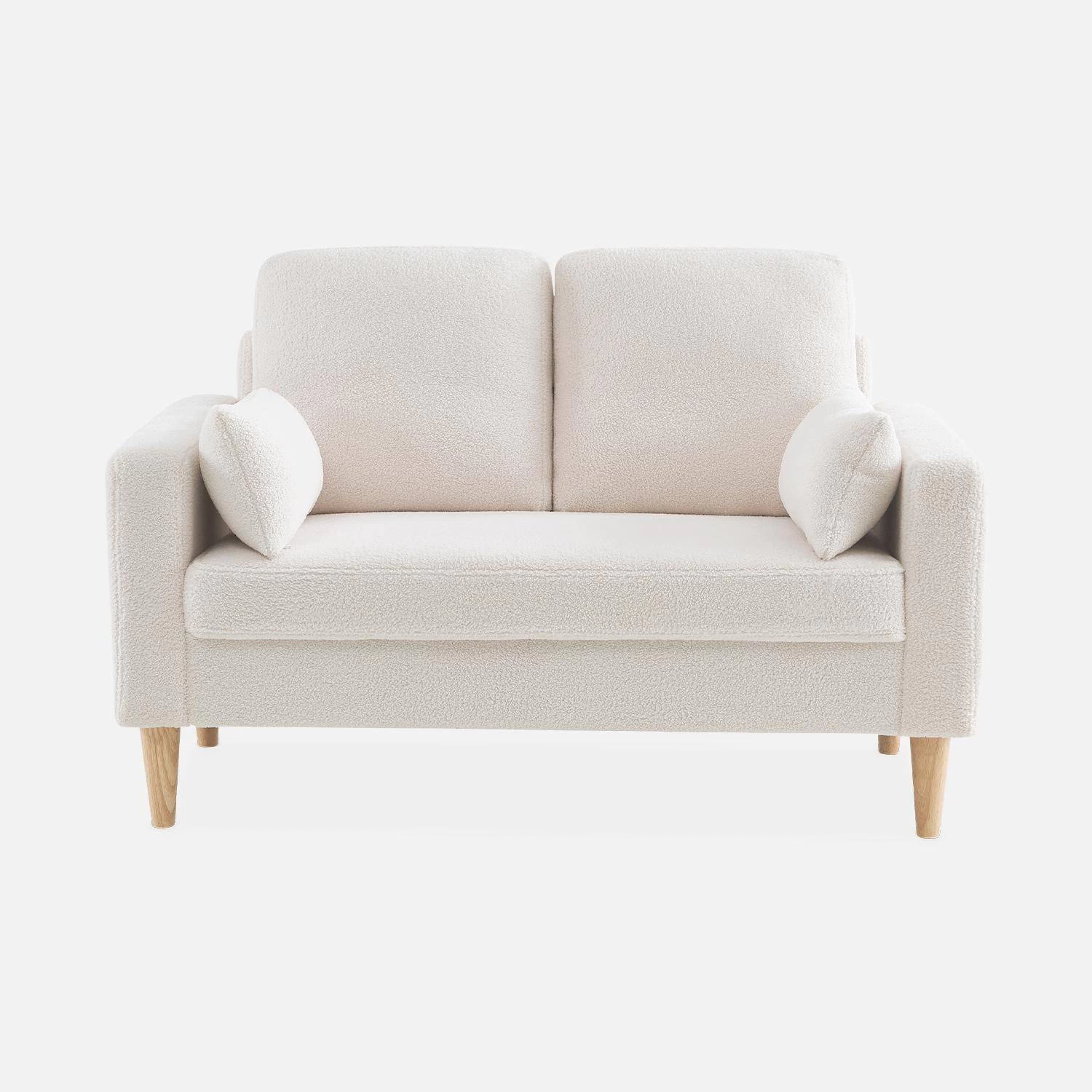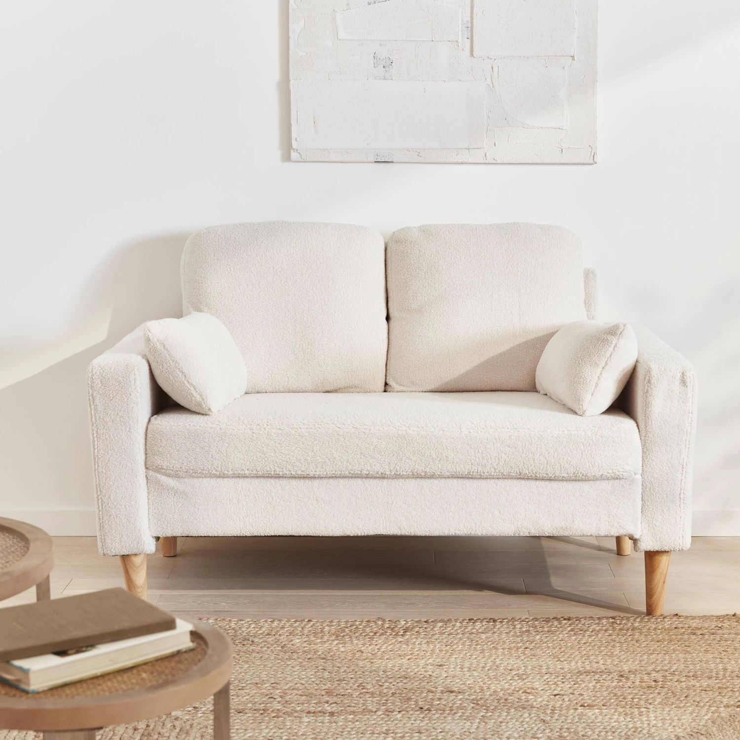 Ce canapé aux lignes arrondies est une invitation au cocooning. Avec son revêtement bouclette tout doux, effet laine de mouton, vous n’aurez qu’une envie, vous blottir dans ce petit cocon. Sa structure en bois solide est chaleureuse et son coloris naturel apporte un côté épuré et zen à votre intérieur. Pratique, il se glisse facilement dans de petits espaces. Son assise ferme et profonde ainsi que son dossier épais et ses larges accoudoirs le rendent confortable. Aucun doute, ce canapé fera l’unanimité dans votre maison !