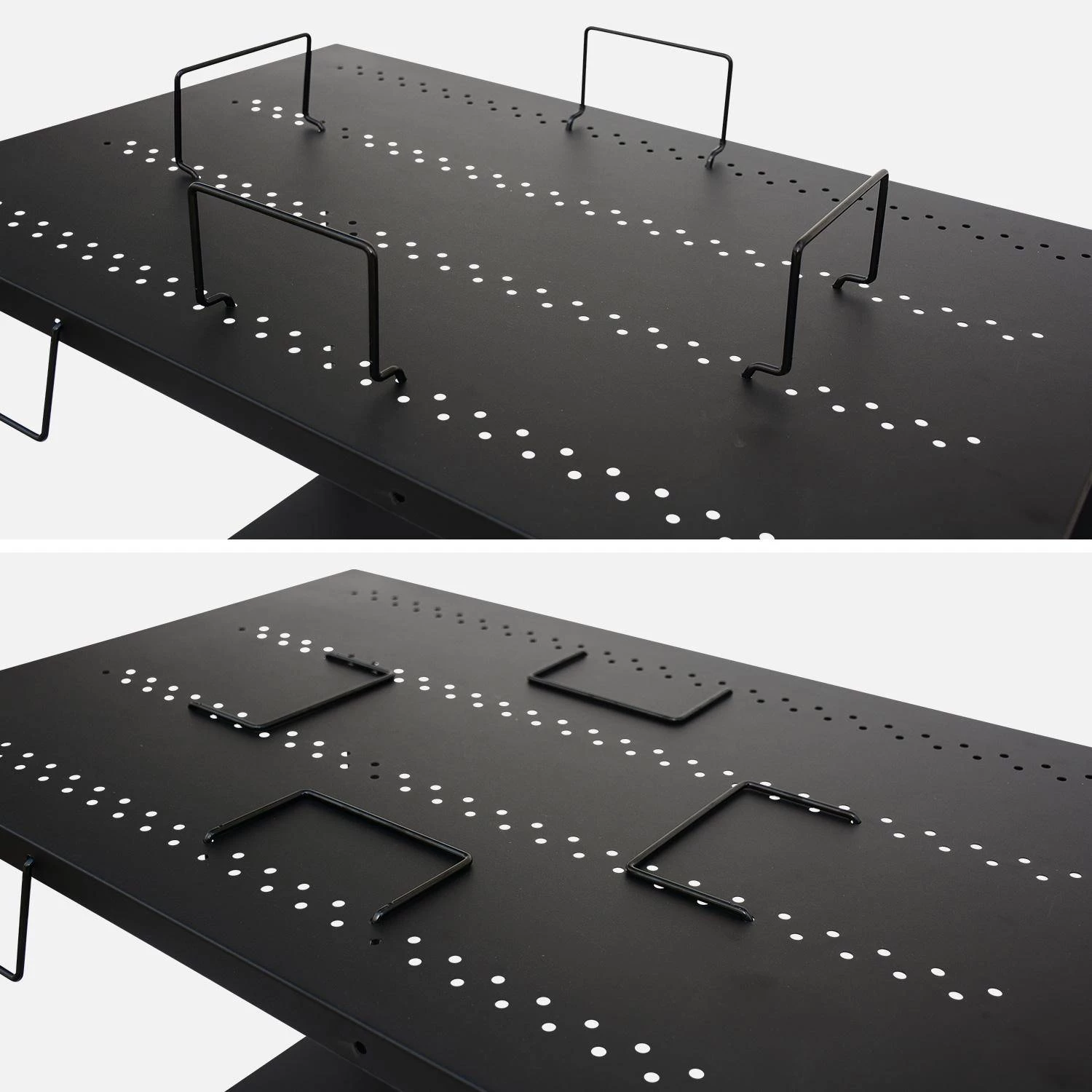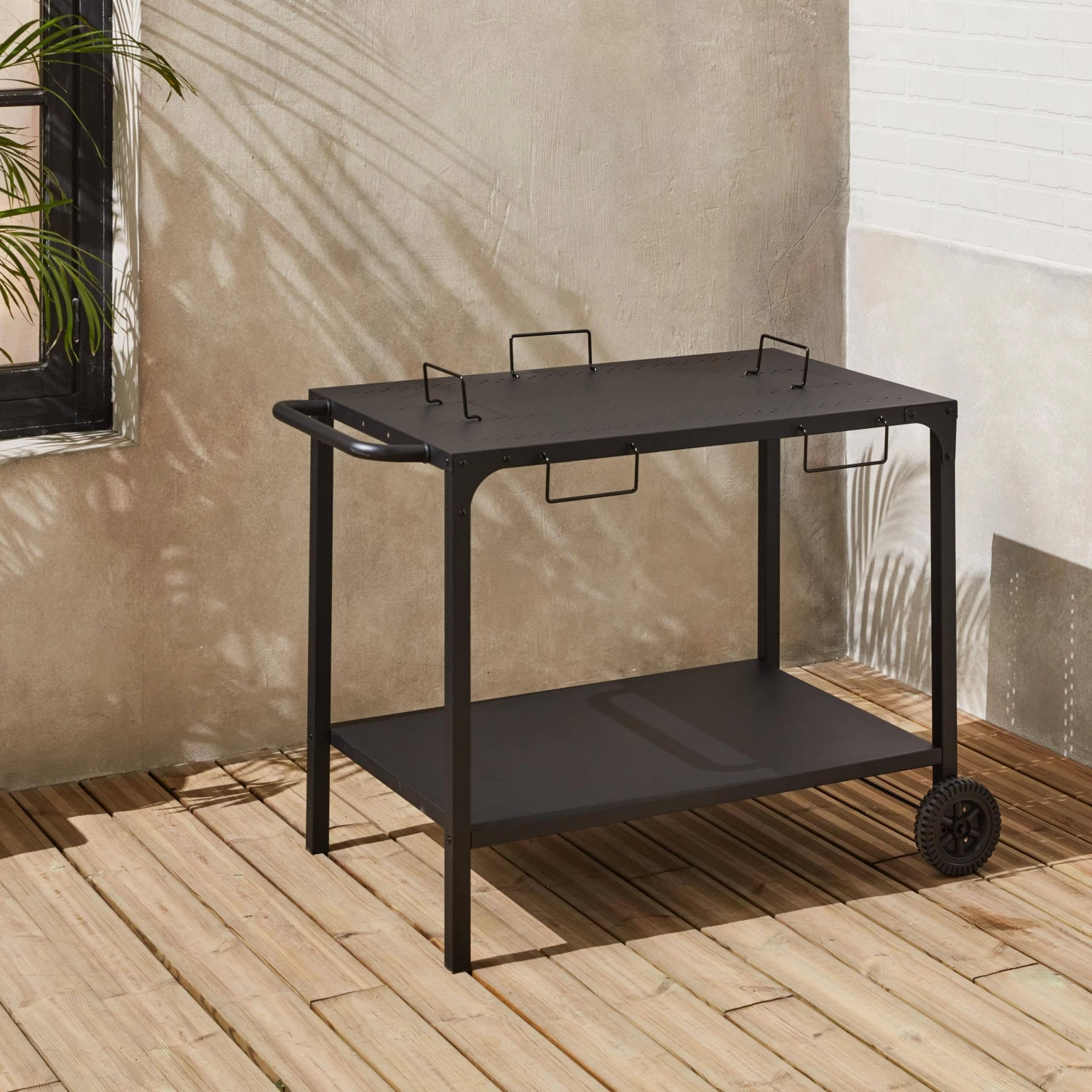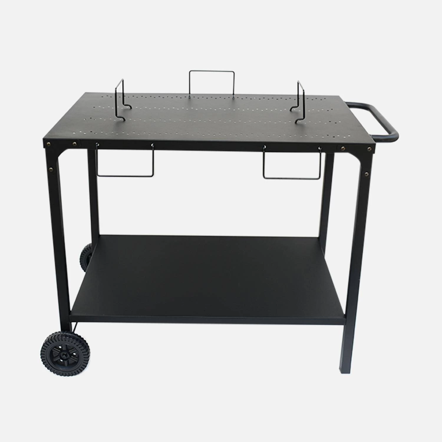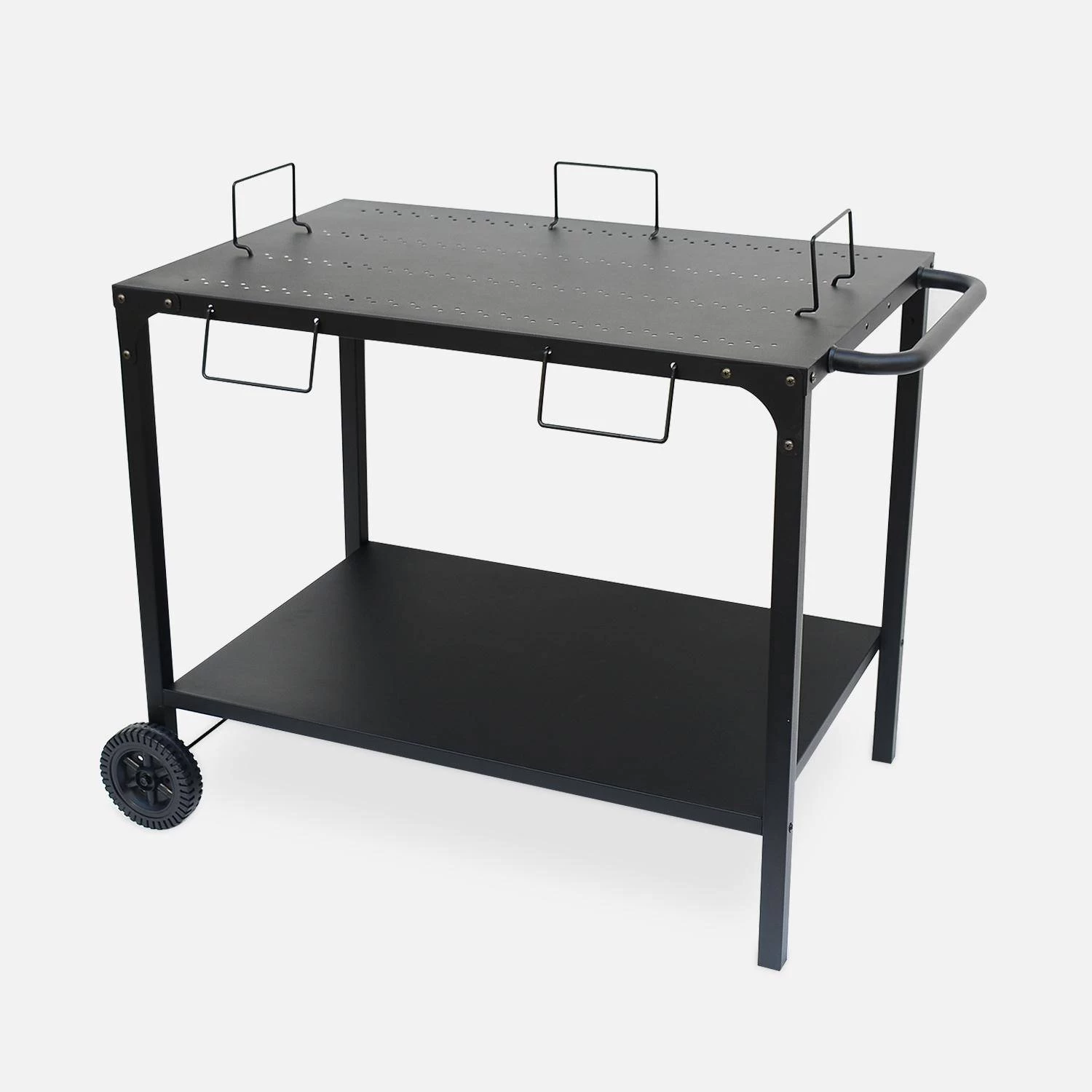 Cette desserte noir en acier est idéale pour utiliser votre plancha, mais pas que ! 5 crochets métalliques sont fournis et peuvent être placés où vous le souhaitez : sur le plateau supérieur perforé pour caler une plancha ou tout autre accessoire de cuisson, et sur le côté pour y accrocher des torchons et ustensiles. Cette desserte s’adapte à vos envies et besoins. Vous pouvez d’ailleurs tout autant l’utiliser à l’intérieur qu’à l’extérieur. Grâce à sa poignée et à ses deux roues, elle se déplace très facilement pour aller sur votre terrasse ou votre balcon pour vos repas conviviaux ! Sur le plateau inférieur, vous pouvez ranger vos plats ou la bonbonne de gaz de votre plancha.