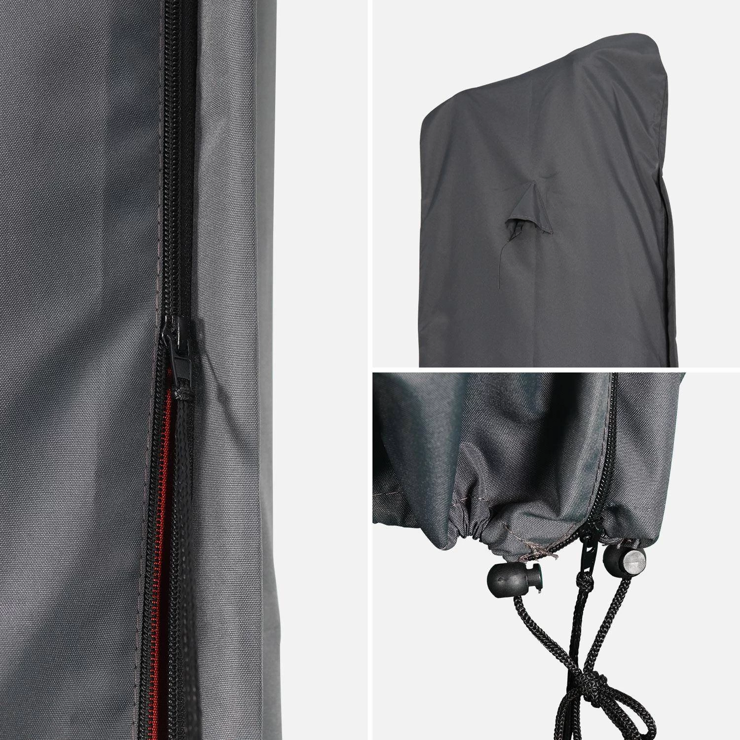 Compatible avec plusieurs de nos parasols, cette housse en polyester et déperlante, protège efficacement leur toile. Nous vous conseillons de ranger votre parasol dans la housse lorsque vous ne l’utilisez pas. Cela le préserve des intempéries et du soleil. En plus, cette housse est pratique. Elle est dotée d’une fermeture éclair et d’une tige en fibre pour faciliter la mise en place de la housse.
