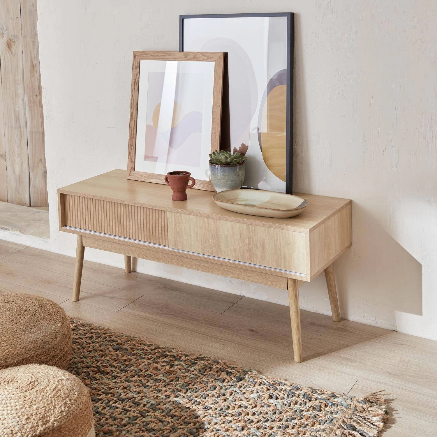 Laissez vous sĂ©duire par le meuble TV Linear qui laissera entrer le style scandinave dans votre intĂ©rieur. Avec sa structure en dĂ©cor bois et ses pieds compas en pin massif, il est le reflet mĂŞme du charme nordique. Les dĂ©tails striĂ©s de sa porte en font une pièce Ă©lĂ©gante et authentique.Â