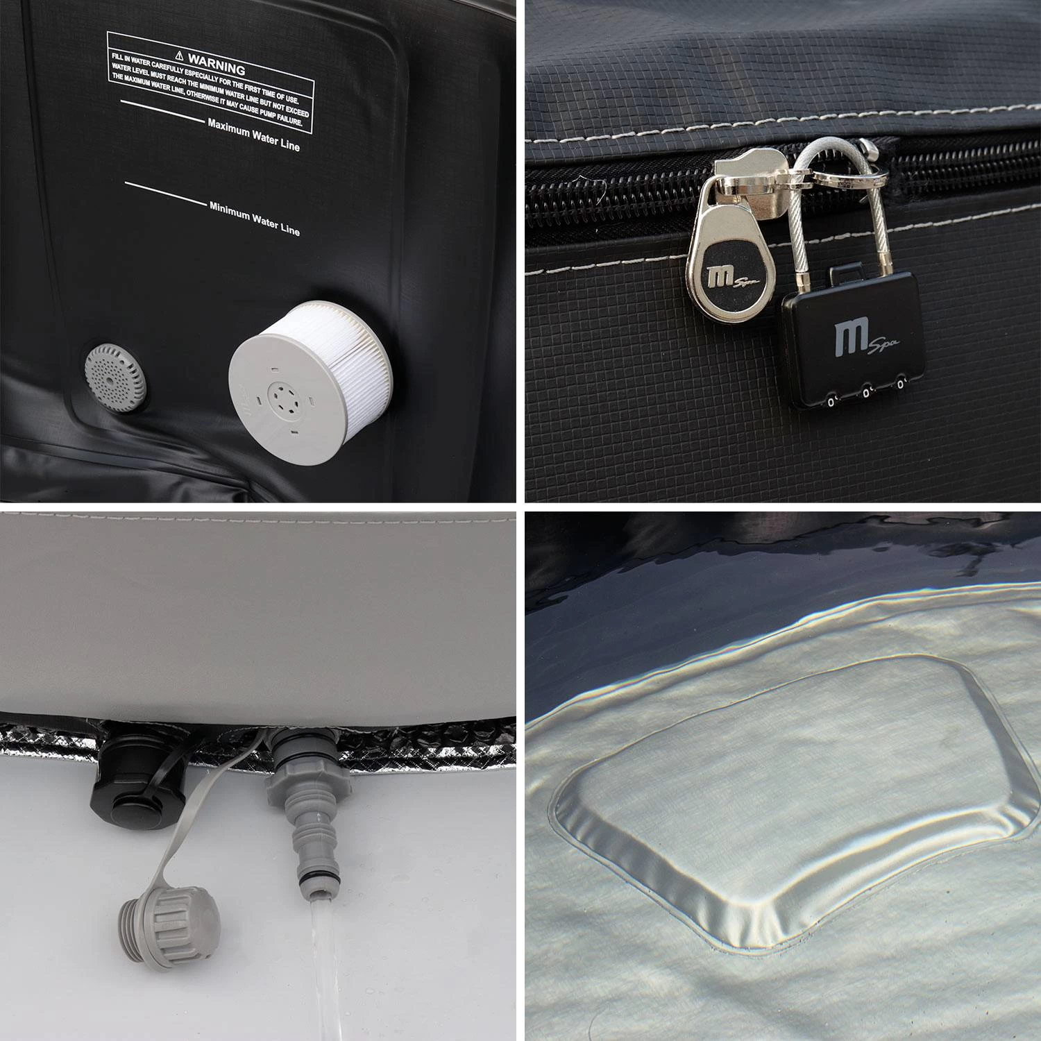 Un système de vidange avec adaptateur pour tuyau d’arrosage permettra de vider votre spa proprement et sans effort. Le couvercle zippé est revêtu d’un film isotherme, un sous couvercle gonflable et un tapis de sol isolant sont également inclus pour garder l’eau chaude plus longtemps. Le cadenas fourni verrouille l’installation pour garder la chaleur et éviter les accidents. Le couvercle gonflable fourni avec le spa garde la chaleur plus longtemps.