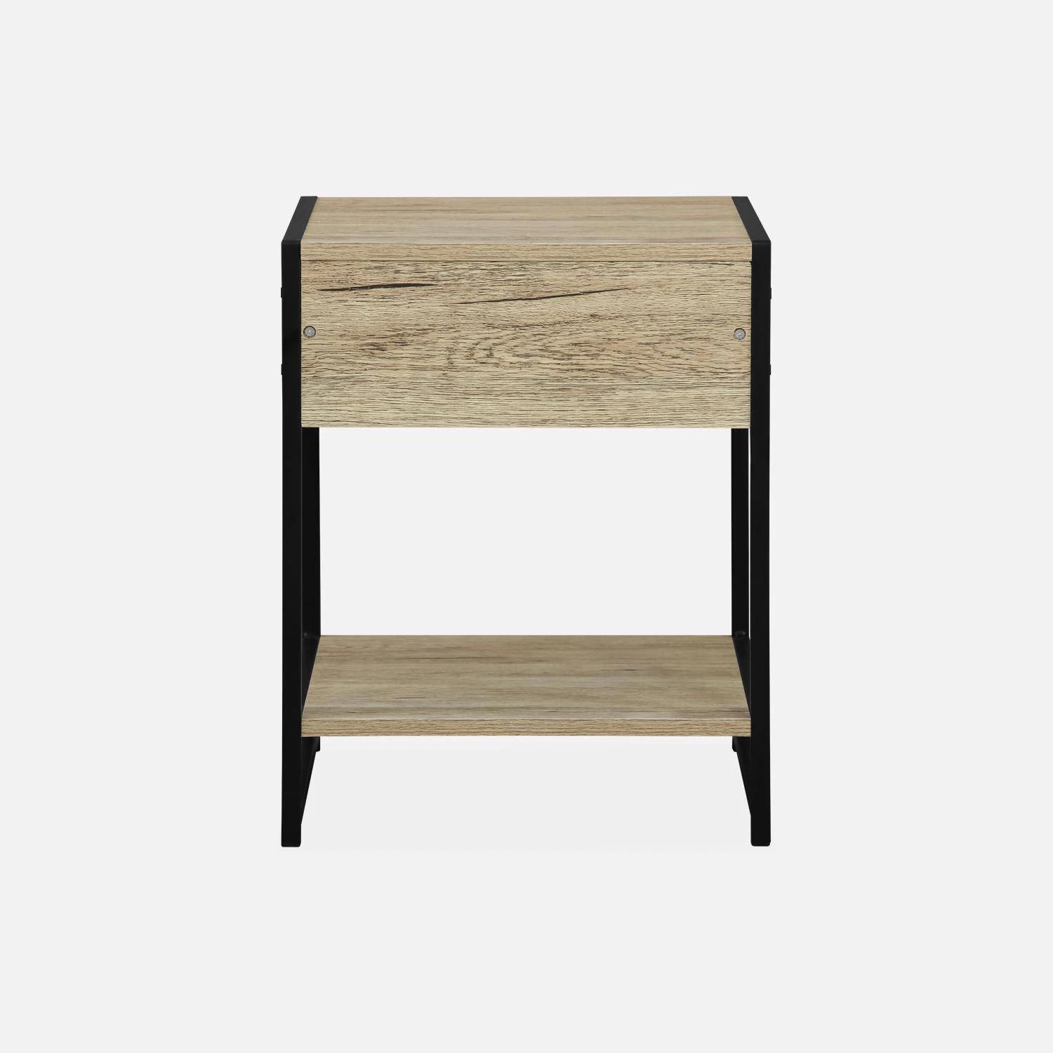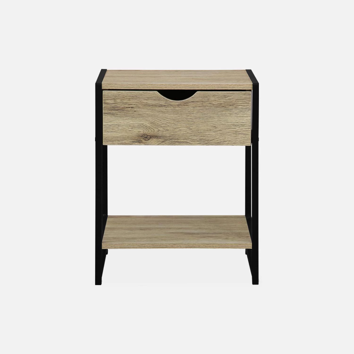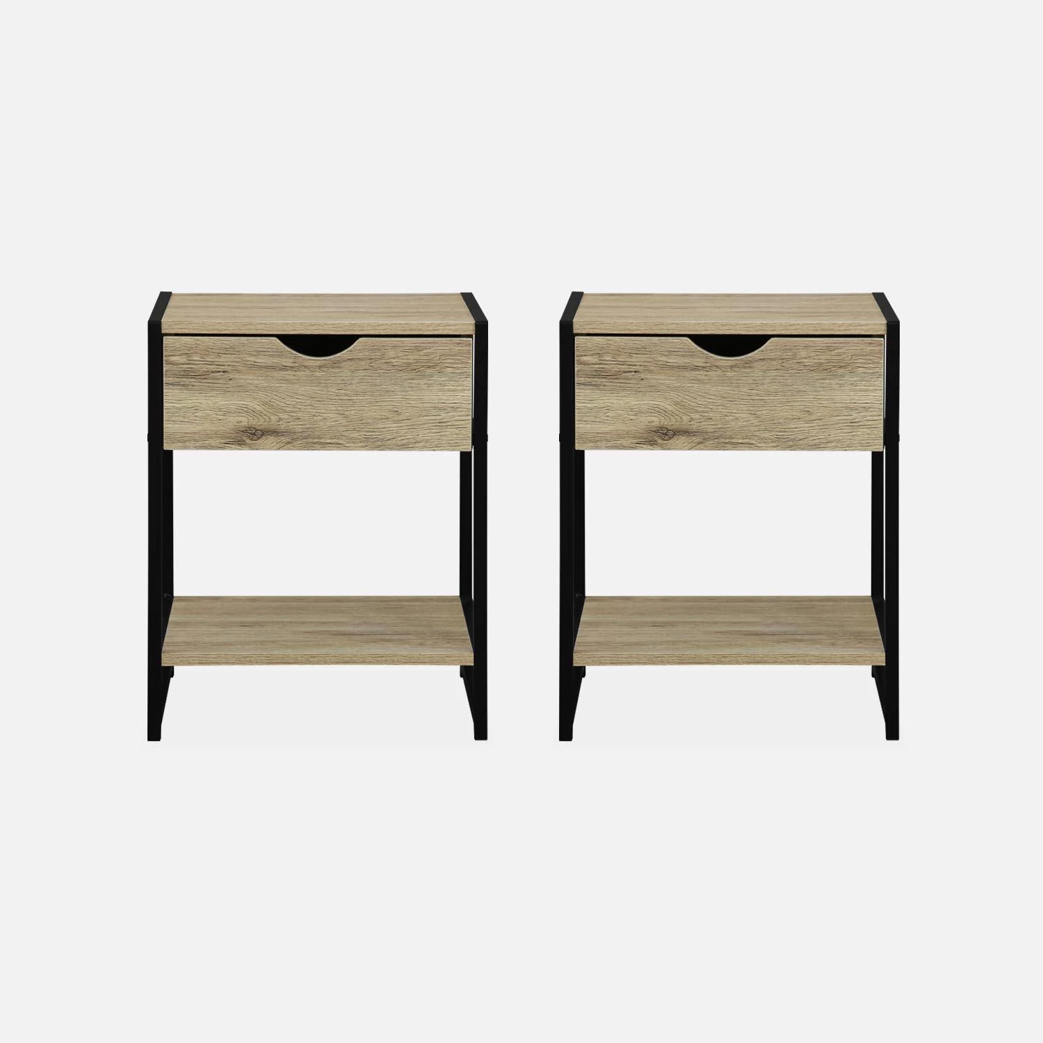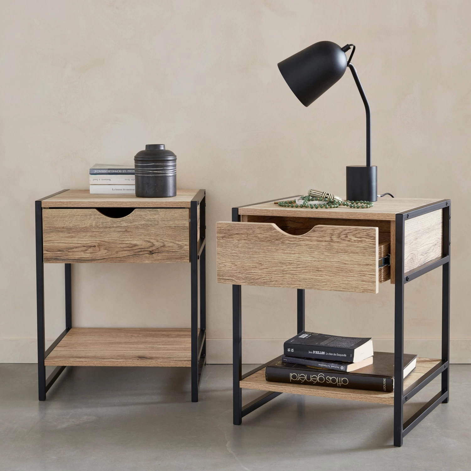 Ce lot de deux tables de chevet est idéal pour ajouter un côté industriel à votre intérieur. Leur bi-matière combinant le noir et le décor bois clair, rend le tout très tendance. Dotées d’un tiroir et d’une étagère vous disposerez de deux rangements fonctionnels pour ranger vos affaires. Dans leur tiroir avec poignet à encoche, vous pourrez placer vos lunettes, télécommandes et toutes les affaires que vous souhaitez garder à proximité de votre lit. Quant à leur étagère, pourquoi ne pas y mettre vos livres, et autres éléments décoratifs ? Enfin placez sur leur plateau : bougies, réveil, crèmes de nuit, lampes et portable. Modernisez votre chambre à coucher en adoptant ce lot de deux tables de chevet pour un coin nuit idéal.