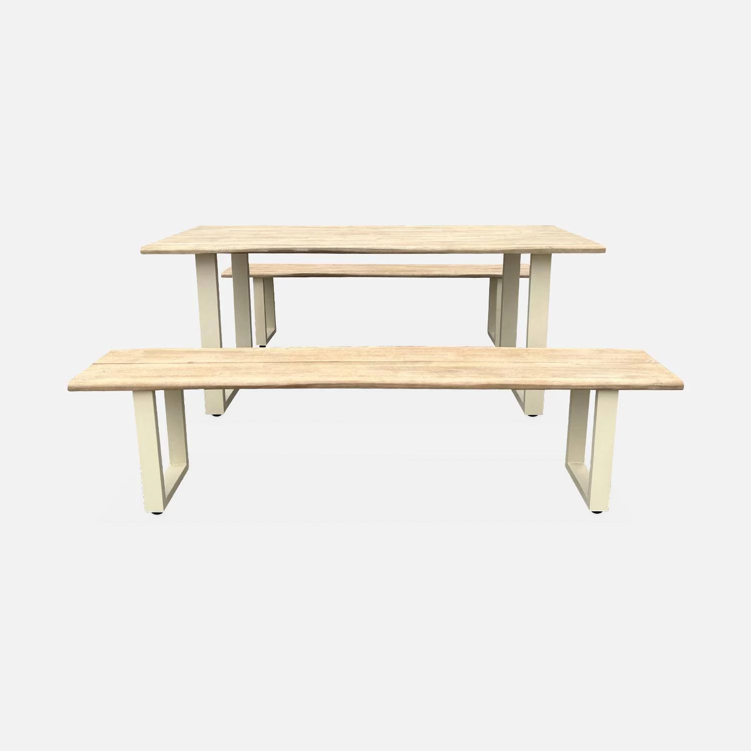 Le plateau de la table est en acacia, un bois solide qui supporte les intempéries. En plus, il est certifié 100% FSC ce qui veut dire qu’il garantit le respect de l’environnement et de la gestion durable des forêts. Le piètement traîneau apporte stabilité et résistance à la structure. Il est en acier galvanisé.