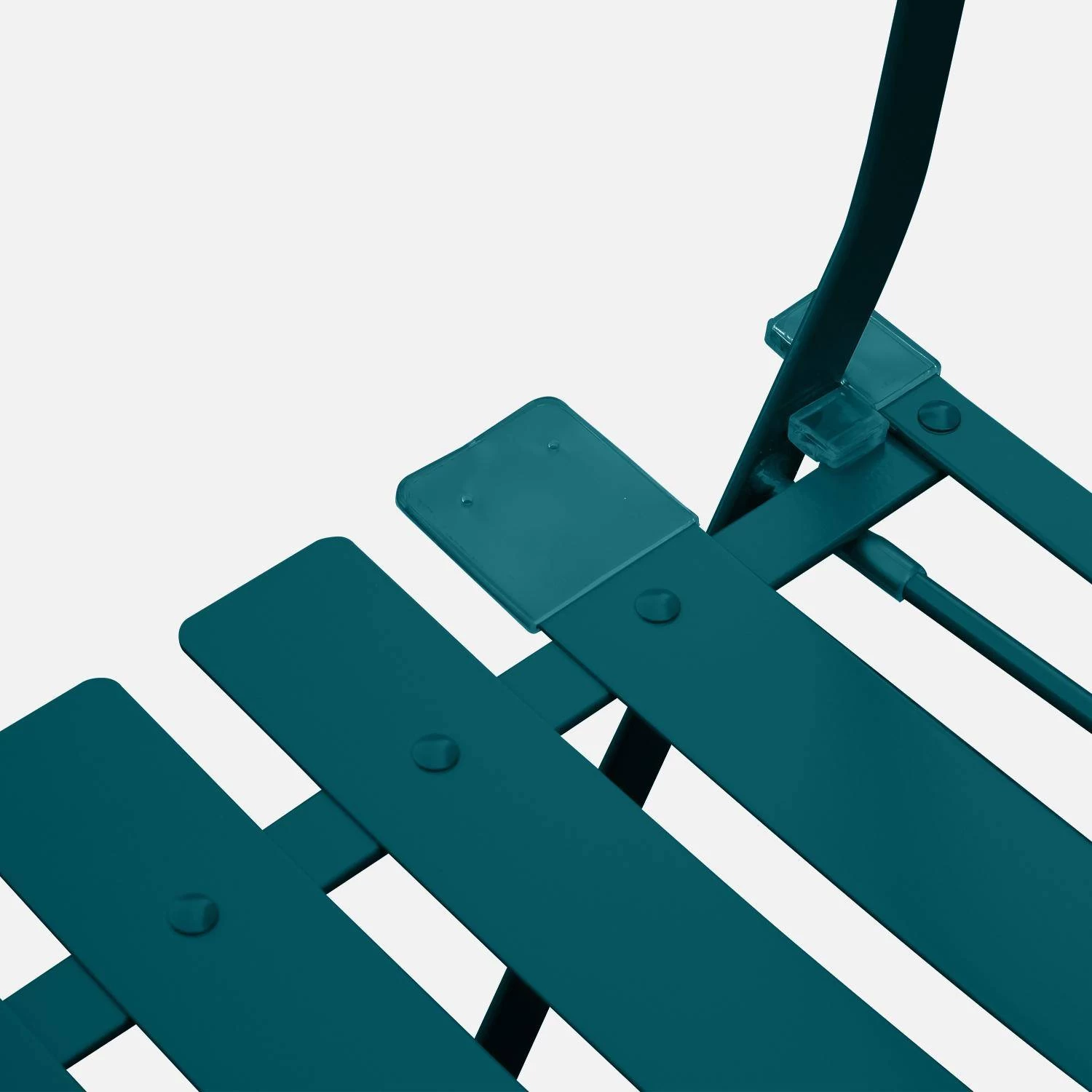 Cet ensemble en acier peint par cataphorèse est pratique. Il est robuste, léger et facile à ranger grâce à la table et aux chaises qui se plient. Pour plus de confort, les lattes des chaises sont incurvées.