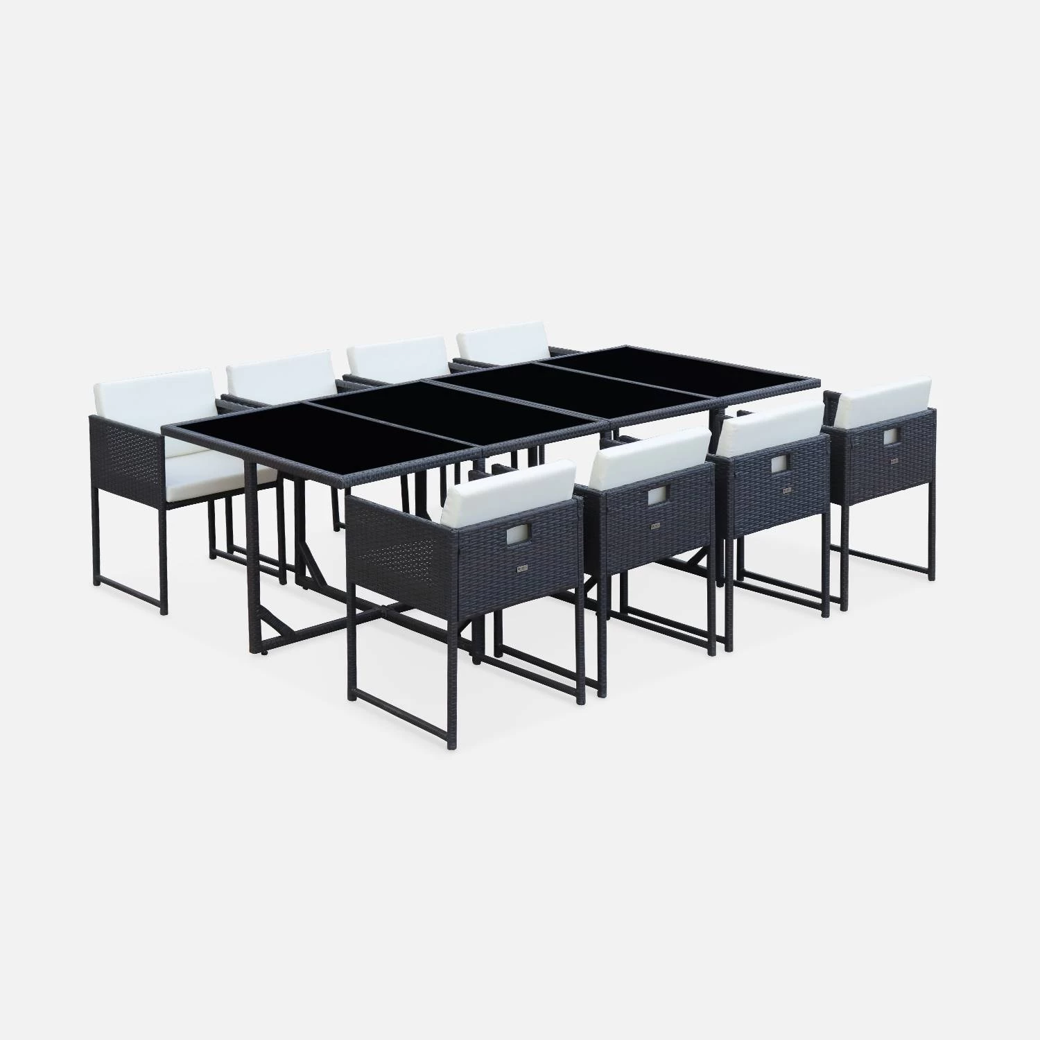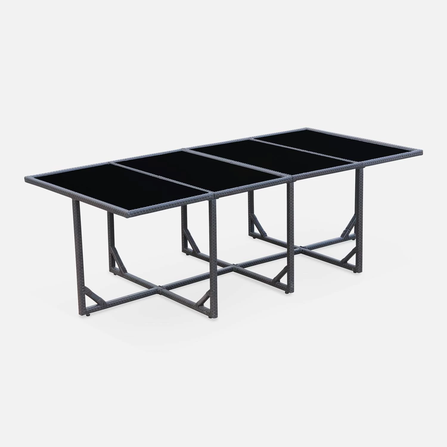Voici un salon de jardin en résine marron pour 8 personnes. Ce salon prend très peu de place lorsqu’il n’est pas utilisé car il est encastrable, et vous pouvez même y laisser les coussins lors du beau temps. La structure en acier galvanisé permet d’obtenir un salon de jardin léger, facile à bouger, notamment les chaises qui sont en plus dotées de poignées. De plus, cette matière est robuste et non corrosive. Dans une question d’esthétique, la structure est également recouverte de résine plate. Les quatre verres trempés, de 5mm d’épaisseur, apportent une finition élégante à la table.