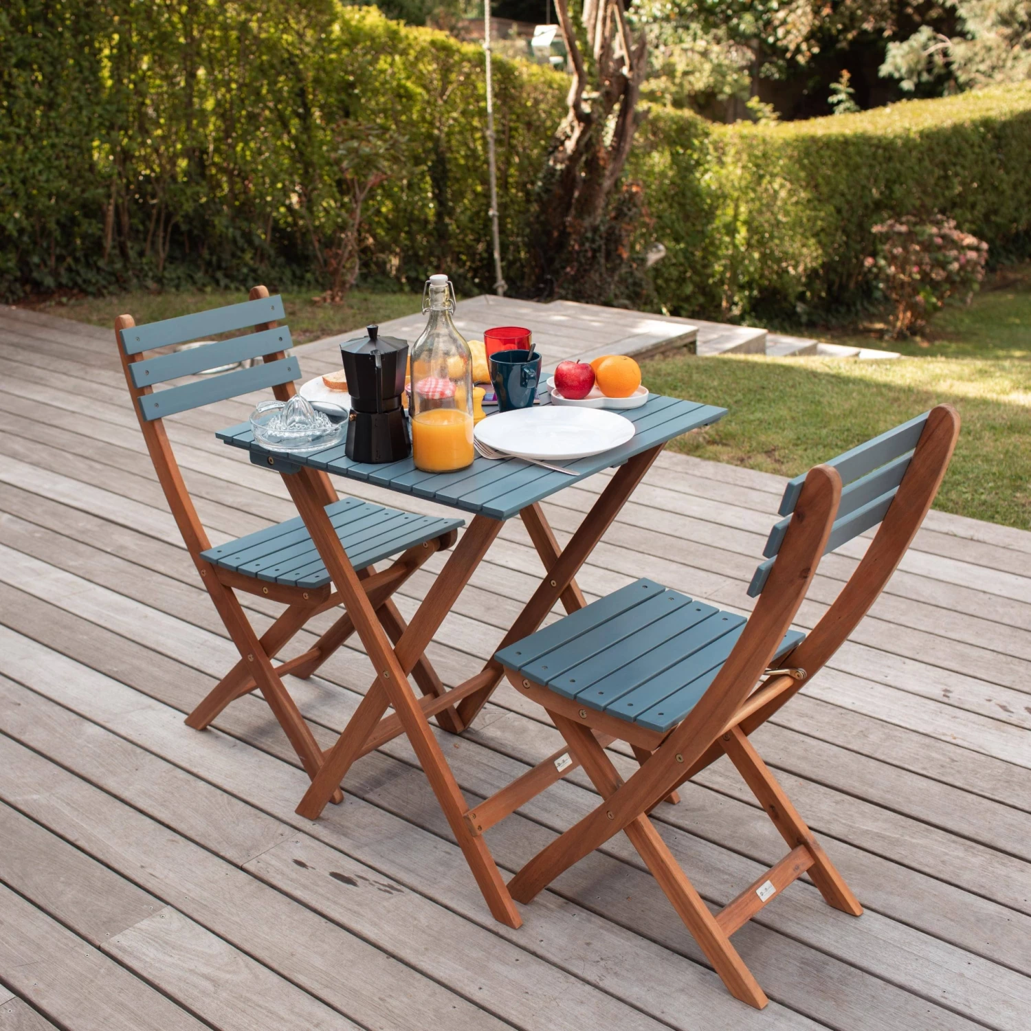 Barcelona est un joli ensemble de jardin type bistrot. Le plateau de la table, le dossier et l’assise des chaises sont peints. Cela apporte une touche d’originalité au salon de jardin. Fabriqué en bois d’acacia, son style est intemporel. Il est composé d’une table carrée et de deux chaises pliables et est donc adapté aux petits espaces. Robuste, mais léger, il se manipule et se range facilement.